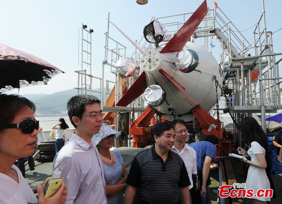 Residents visit China's manned deep-sea research submersible Jiaolong and its mother ship Xiangyanghong No. 9 in Fuzhou city of Fujian province on July 3, 2014.Jiaolong and its mother ship docked at Mawei port on July 1 and will leave for West Pacific Ocean for scientific research on Friday, July 4. (Source: Ecns.cn)