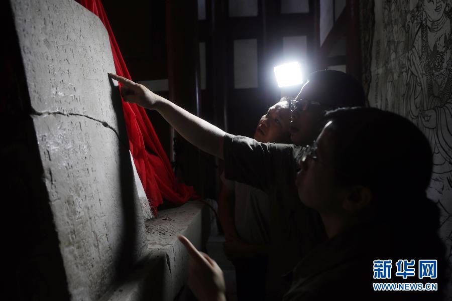 Researchers read the inscription on a tablet of the third prettifying on June 16, 2014. (Photo/ Luo Guojia)