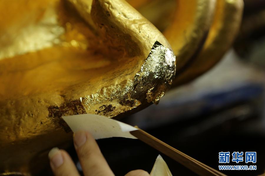 Specialists apply beaten gold on the statue of the thousand-armed Buddha on Baoding Mountain in Southwest China’s Chongqing municipality on June 28, 2014.