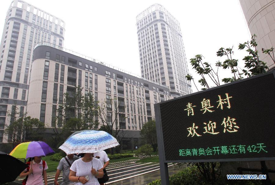 Media workers visit the Youth Olympic Village in Nanjing, capital of east China's Jiangsu Province, July 4, 2014. The Nanjing 2014 Youth Olympic games will be held from August 16 to 28, attracting 3808 youth athletes from 204 countries and regions. (Xinhua/Gao Jing)