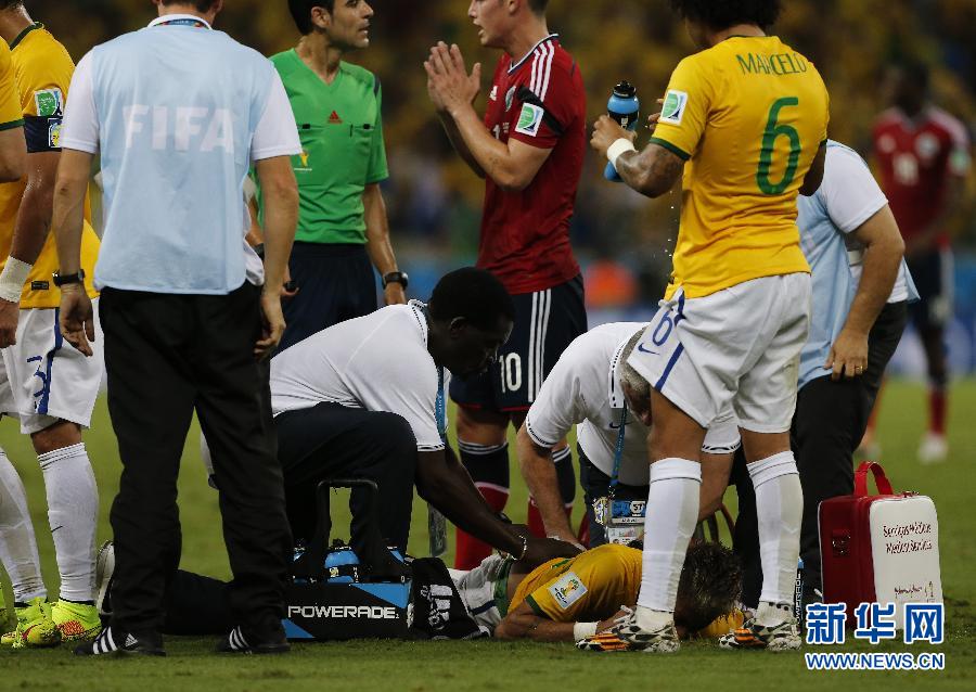 Brazil have suffered a huge setback as team doctor confirmed star man Neymar suffered a broken vertebra and is out of the World Cup after he was stretchered off during the quarterfinal defeat of Colombia. (Photo/Xinhua)