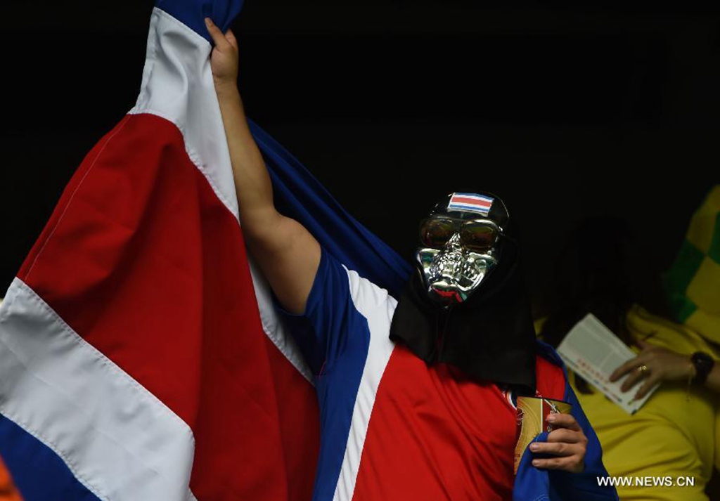 A Costa Rica's fan is seen before a quarter-finals match between Netherlands and Costa Rica of 2014 FIFA World Cup at the Arena Fonte Nova Stadium in Salvador, Brazil, on July 5, 2014.(Xinhua/Guo Yong)
