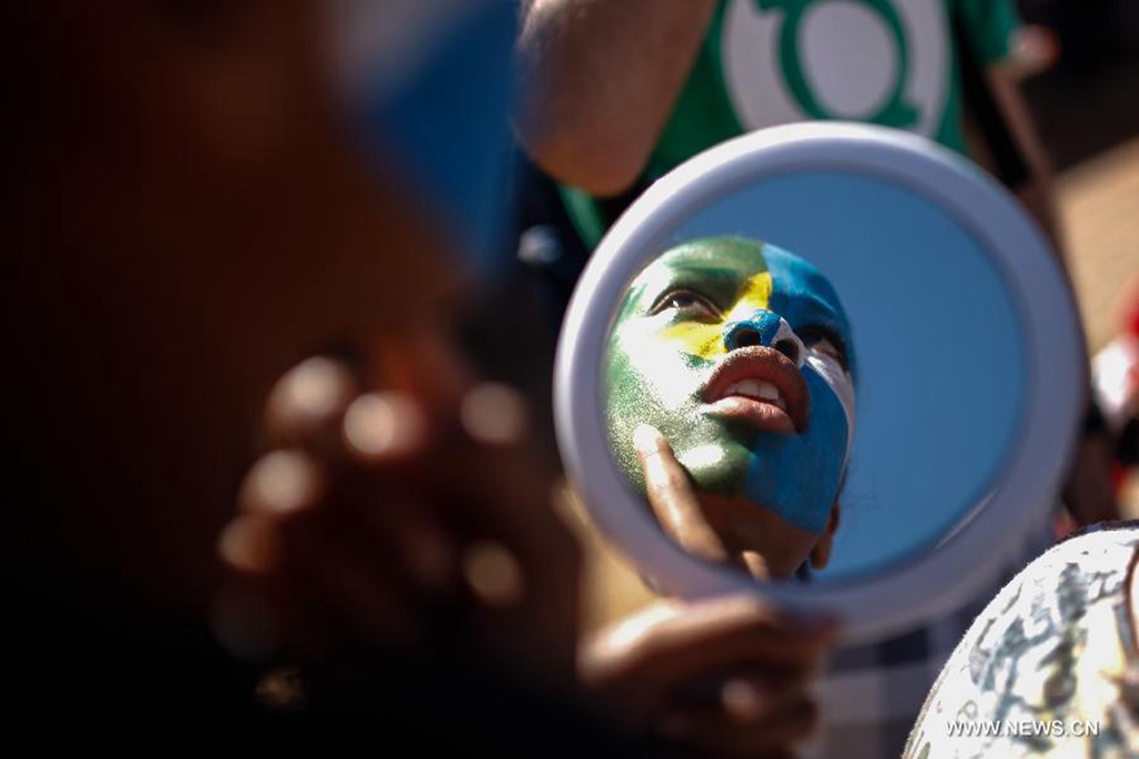 An Argentina's fan is seen before a quarter-finals match between Argentina and Belgium of 2014 FIFA World Cup in Brasilia, Brazil, on July 5, 2014.(Xinhua/Jhon Paz)
