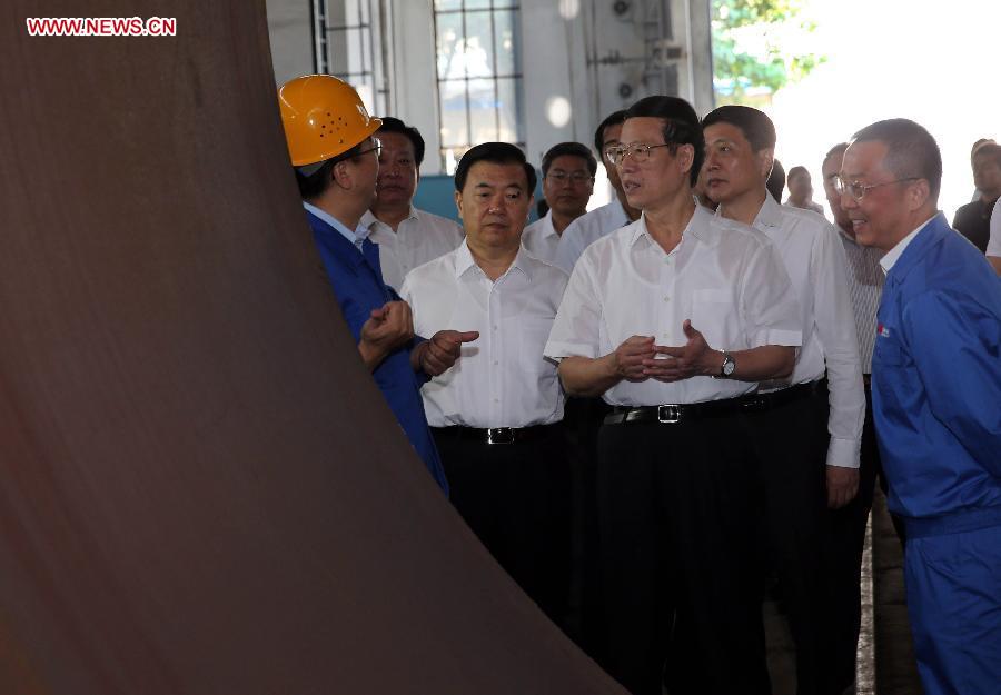 Chinese Vice Premier Zhang Gaoli (2nd R, front), also a member of the Standing Committee of the Political Bureau of the Communist Party of China Central Committee, visits Lanzhou Lanshi Group Co. Ltd. in Lanzhou, capital of northwest China's Gansu Province, July 4, 2014. Zhang Gaoli made an inspection tour to Ningxia Hui Autonomous Region and Gansu Province from July 2 to 5. (Xinhua/Liu Weibing)
