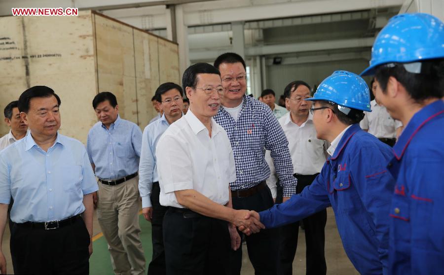Chinese Vice Premier Zhang Gaoli (C), also a member of the Standing Committee of the Political Bureau of the Communist Party of China Central Committee, visits Lanzhou Haimo Technologies Co. Ltd. in Lanzhou, capital of northwest China's Gansu Province, July 3, 2014. Zhang Gaoli made an inspection tour to Ningxia Hui Autonomous Region and Gansu Province from July 2 to 5. (Xinhua/Liu Weibing)