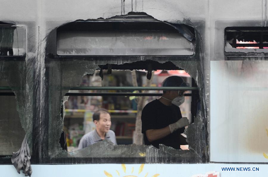 An investigator is seen in the burnt bus in Hangzhou, east China's Zhejiang Province, July 5, 2014. Thirty-two injured people were sent to hospitals after a bus caught fire on Saturday afternoon in downtown Hangzhou. No death case has been reported. The cause of the blaze is being investigated. (Xinhua/Han Chuanhao)