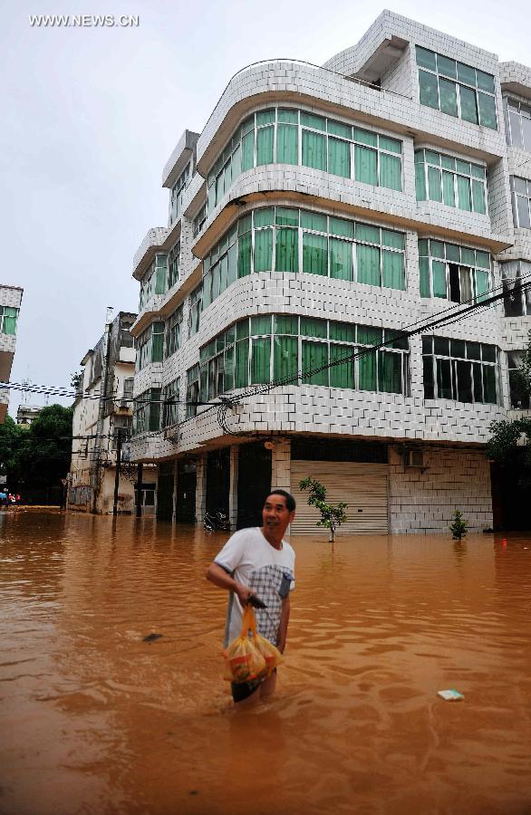 A man walks in flood water in Mashan County, south China's Guangxi Zhuang Autonomous Region, July 5, 2014. Torrential rain hit Guangxi since July 4, where the precipitation exceeded 100 mm in 21 counties. (Xinhua/Zhang Ailin)