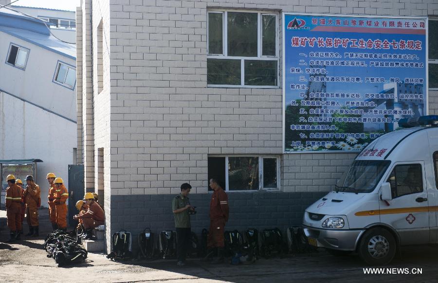 Rescuers wait to enter the pit where a gas blast traps 17 miners at the No. 1 coal pit of Dhuangshan Yunxin Coal Mining Co., Ltd, in Fukang City, northwest China's Xinjiang Uygur Autonomous Region, July 6, 2014. The blast happened at 8:43 p.m. on Saturday, when 20 people were working inside the mine. Three of them have been rescued. Rescuers are pouring nitrogen into the mine to dilute the gas concentration. The process, which was started early on Sunday morning, needs to be continued for 24 hours before it is safe to enter the pit, said rescuers. (Xinhua/Jiang Wenyao)