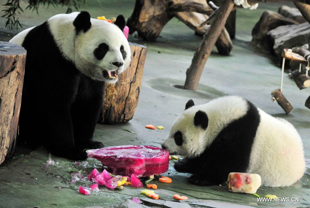 Giant panda "Yuanzai"(R) and its mother "Yuanyuan" taste its one-year-old birthday cake at the Taipei Zoo in Taipei, southeast China's Taiwan, July 6,2014. (Xinhua/Wu Ching-teng)