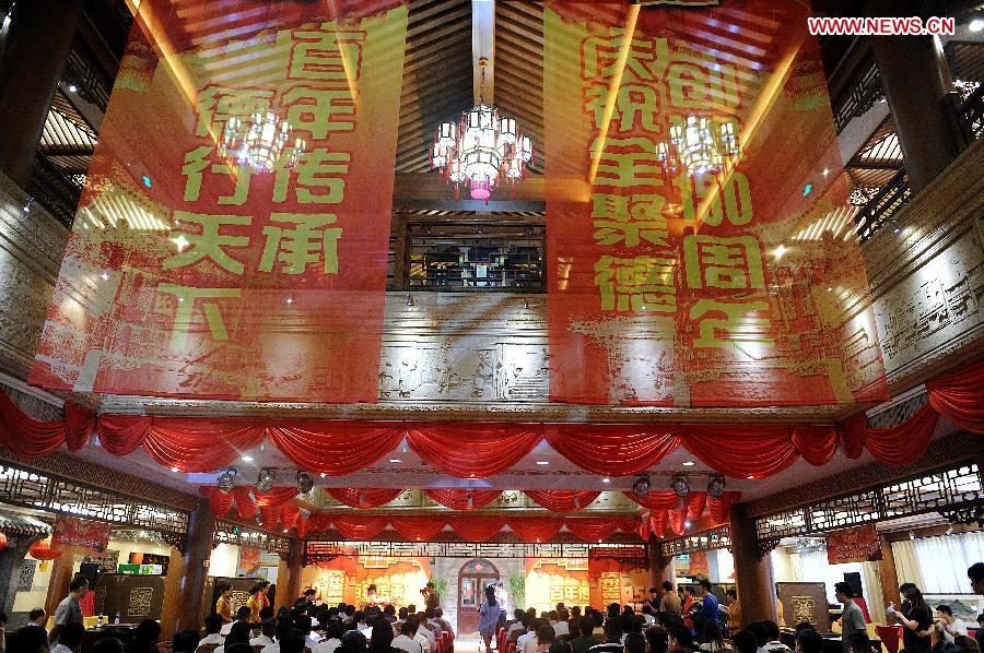 A ceremony for the 150th anniversary of Quanjude Beijing Roast Duck Restaurant is held at its Qianmen Store in Beijing, capital of China, July 2, 2014. (Xinhua/Zhang Yan)