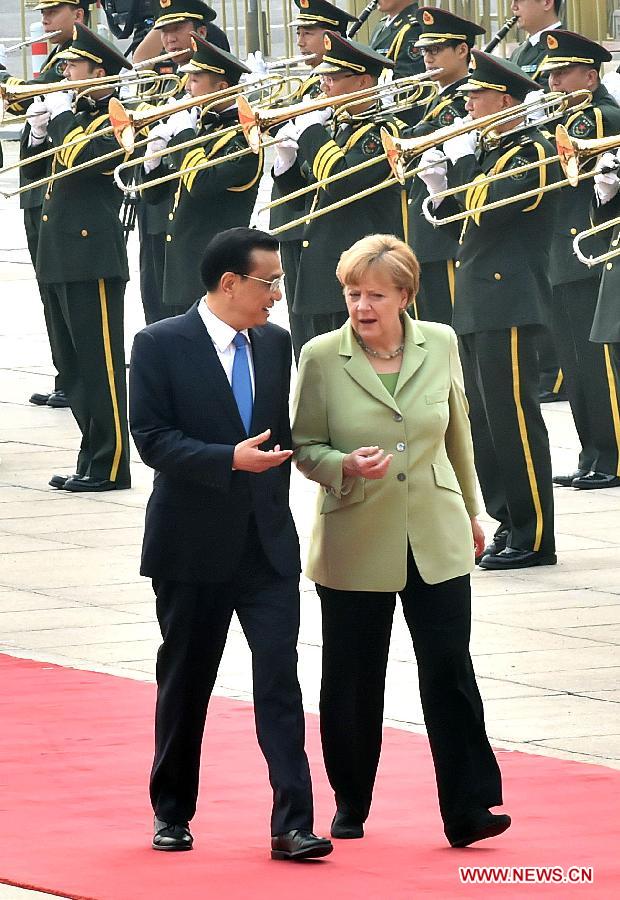 Chinese Premier Li Keqiang (L) holds a welcoming ceremony for visiting German Chancellor Angela Merkel in Beijing, capital of China, July 7, 2014. (Xinhua/Li Tao)