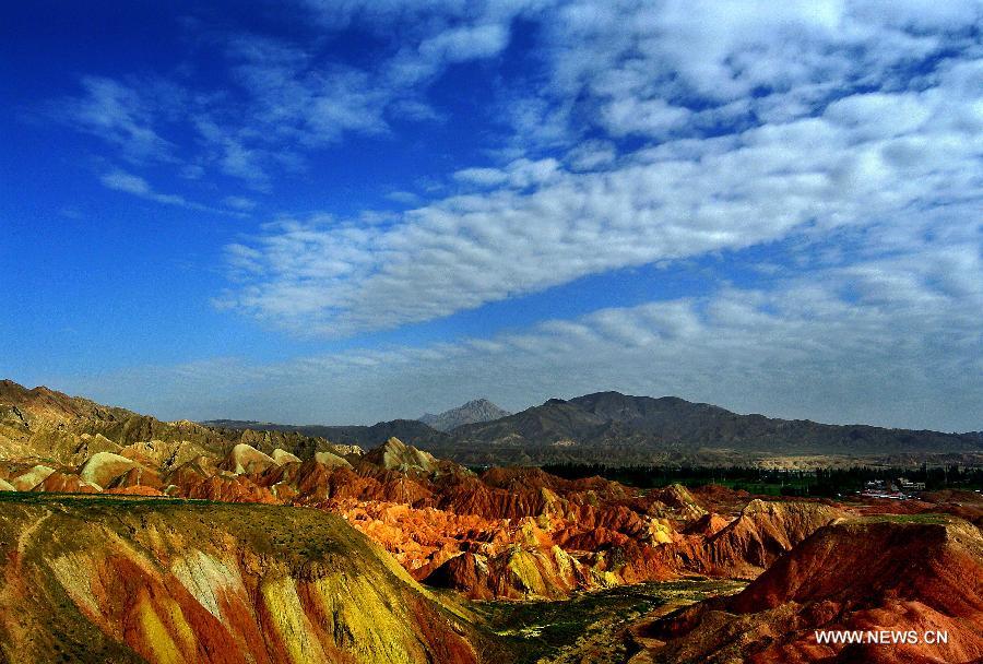 Photo taken on July 7, 2014 shows the scenery at Zhangye Danxia Landform Geological Park in Zhangye City, northwest China's Gansu Province. Danxia, which means "rosy cloud", is a special landform formed from reddish sandstone that has been eroded over time into a series of mountains surrounded by curvaceous cliffs and many unusual rock formations. (Xinhua/Wang Song)