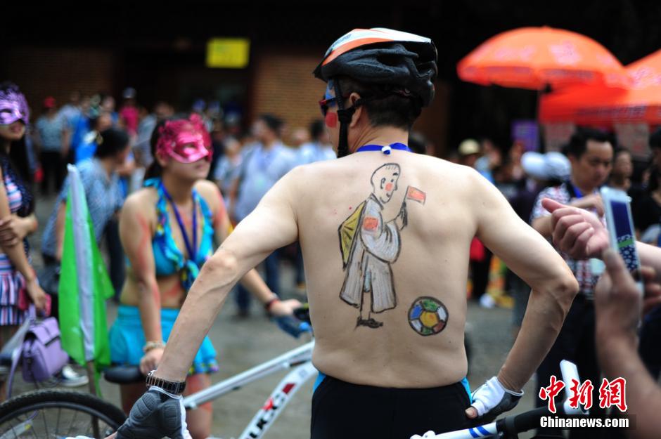 Body-painted participants from China and abroad take part in the cycling race held in Zhangjiajie, central China's Hunan province on July 5, 2014. (Photo/CNS)