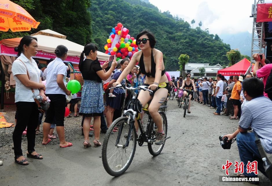 Body-painted participants from China and abroad take part in the cycling race held in Zhangjiajie, central China's Hunan province on July 5, 2014. (Photo/CNS)