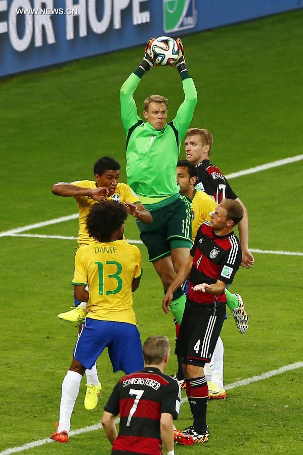 Germany's goalkeeper Manuel Neuer (up) grabs the ball during a semifinal match between Brazil and Germany of 2014 FIFA World Cup at the Estadio Mineirao Stadium in Belo Horizonte, Brazil, on July 8, 2014.(Xinhua/Liu Bin)
