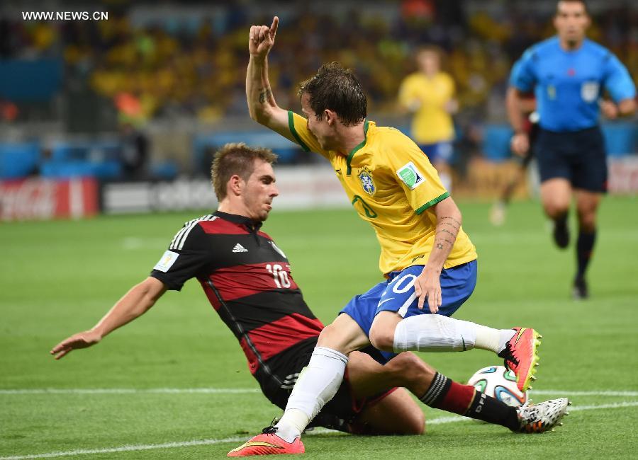 Brazil's Bernard vies with Germany's Philipp Lahm during a semifinal match between Brazil and Germany of 2014 FIFA World Cup at the Estadio Mineirao Stadium in Belo Horizonte, Brazil, on July 8, 2014.(Xinhua/Li Ga)