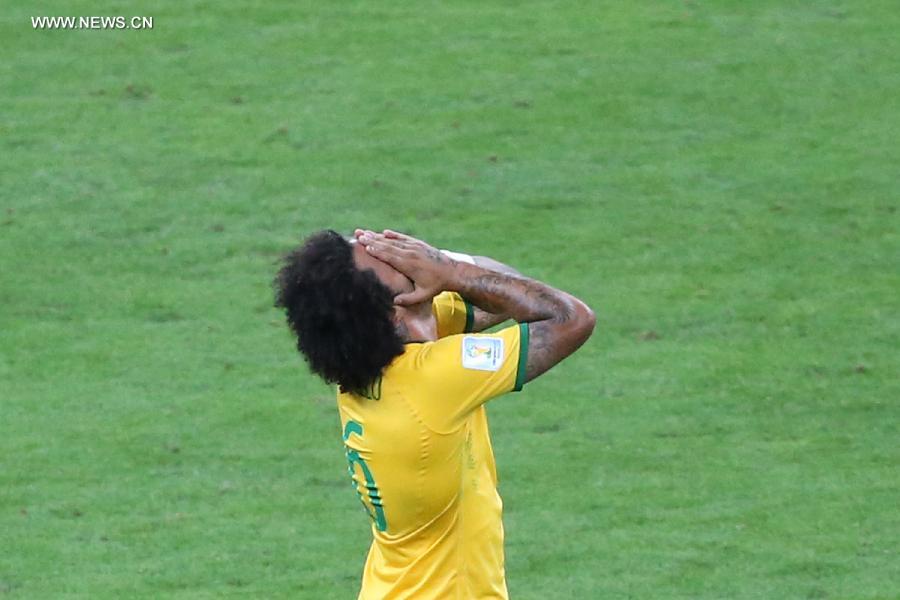 Brazil's Marcelo reacts during a semifinal match between Brazil and Germany of 2014 FIFA World Cup at the Estadio Mineirao Stadium in Belo Horizonte, Brazil, on July 8, 2014.(Xinhua/Li Ming)