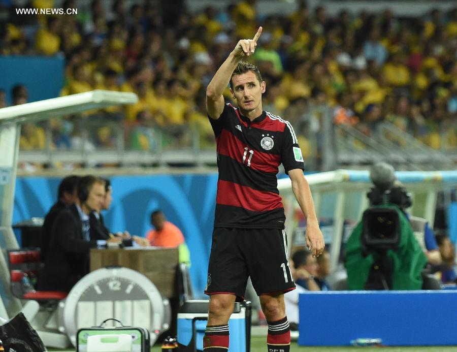 Germany's Miroslav Klose greets the spectators after being replaced during a semifinal match between Brazil and Germany of 2014 FIFA World Cup at the Estadio Mineirao Stadium in Belo Horizonte, Brazil, on July 8, 2014.(Xinhua/Liu Dawei)