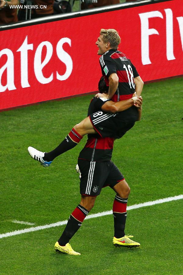 Germany's Toni Kroos (up) celebrates after scoring during a semifinal match between Brazil and Germany of 2014 FIFA World Cup at the Estadio Mineirao Stadium in Belo Horizonte, Brazil, on July 8, 2014.(Xinhua/Liu Bin)
