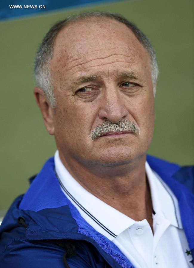 Brazil's coach Luiz Felipe Scolari looks on before a semifinal match between Brazil and Germany of 2014 FIFA World Cup at the Estadio Mineirao Stadium in Belo Horizonte, Brazil, on July 8, 2014.(Xinhua/Qi Heng)