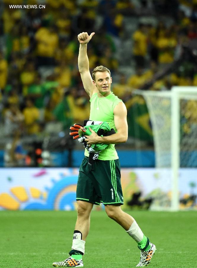 Germany's goalkeeper Manuel Neuer greets Germany's fans after a semifinal match between Brazil and Germany of 2014 FIFA World Cup at the Estadio Mineirao Stadium in Belo Horizonte, Brazil, on July 8, 2014. Germany won 7-1 over Brazil and qualified for the final on Tuesday. (Xinhua/Liu Dawei)