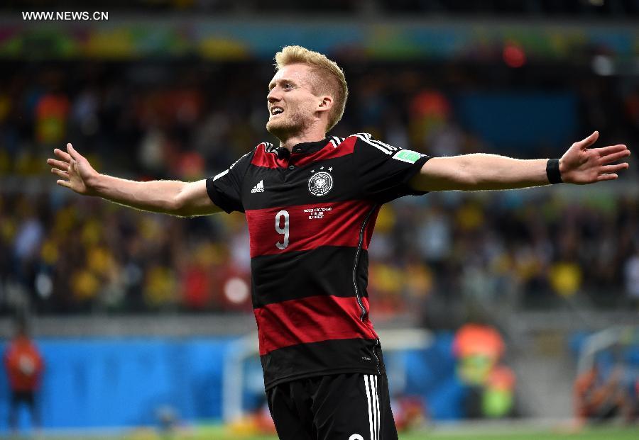 Germany's Andre Schuerrle celebrates a goal during a semifinal match between Brazil and Germany of 2014 FIFA World Cup at the Estadio Mineirao Stadium in Belo Horizonte, Brazil, on July 8, 2014. Germany won 7-1 over Brazil and qualified for the final on Tuesday.(Xinhua/Li Ga)