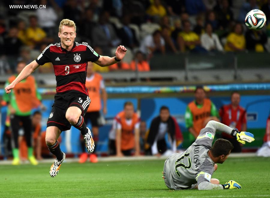 Brazil's goalkeeper Julio Cesar vies with Germany's Andre Schuerrle during a semifinal match between Brazil and Germany of 2014 FIFA World Cup at the Estadio Mineirao Stadium in Belo Horizonte, Brazil, on July 8, 2014. Germany won 7-1 over Brazil and qualified for the final on Tuesday.(Xinhua/Li Ga)