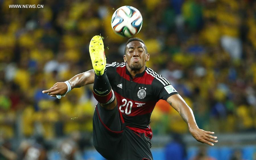 Germany's Jerome Boateng vies for the ball during a semifinal match between Brazil and Germany of 2014 FIFA World Cup at the Estadio Mineirao Stadium in Belo Horizonte, Brazil, on July 8, 2014. Germany won 7-1 over Brazil and qualified for the final on Tuesday.(Xinhua/Chen Jianli)