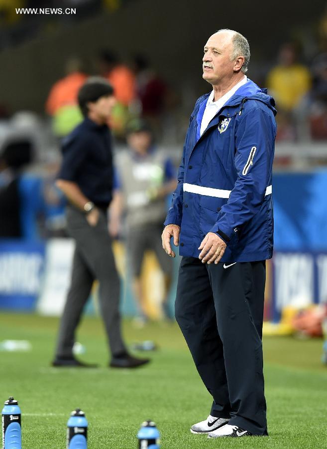 Brazil's coach Luiz Felipe Scolari (front) reacts during a semifinal match between Brazil and Germany of 2014 FIFA World Cup at the Estadio Mineirao Stadium in Belo Horizonte, Brazil, on July 8, 2014.(Xinhua/Qi Heng)