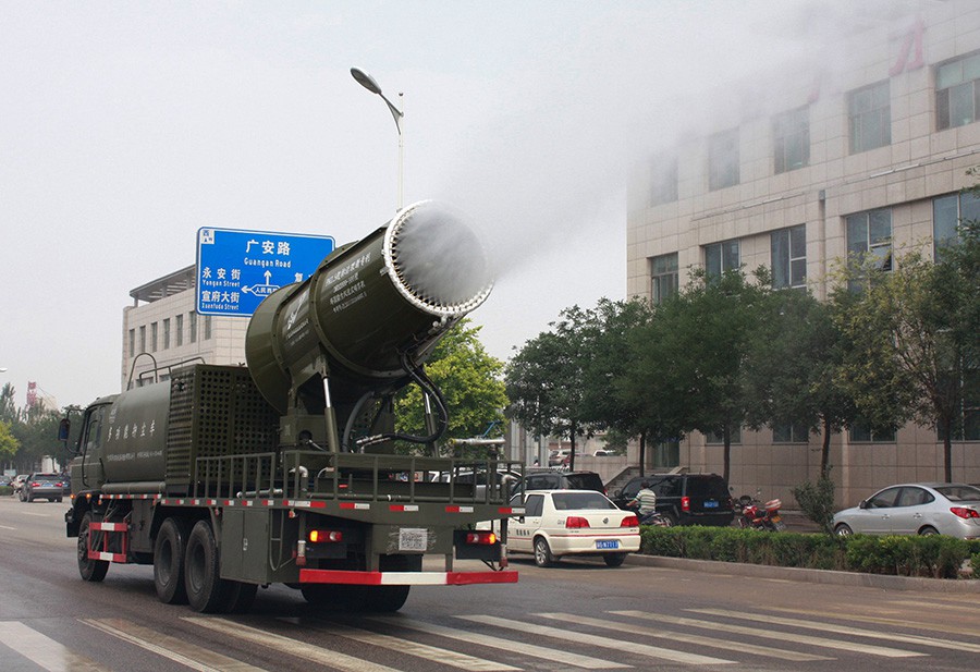 A multi-function vehicle spays water to decrease dust and moisten the air in Xuanhua District, Zhangjiakou, Hebei province on July 7, 2014. (Xinhua/ Chen Xiaodong)