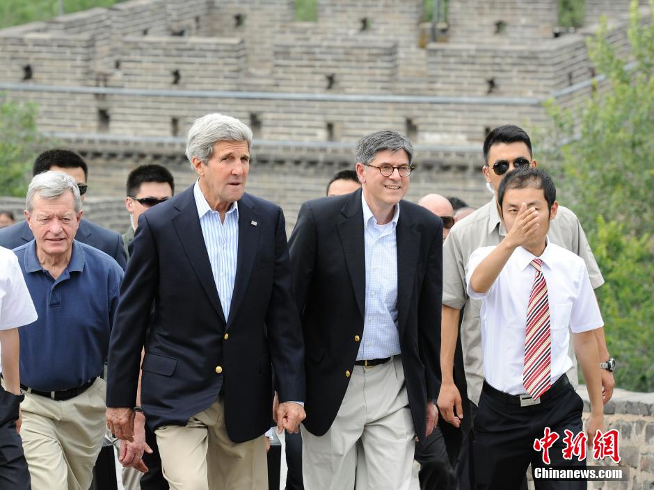 U.S. Secretary of State John Kerry (L) and U.S. Treasury Secretary Jacob Lew (M) visit Badaling Great Wall in Beijing, July 8. (CNS/Hou Yu)