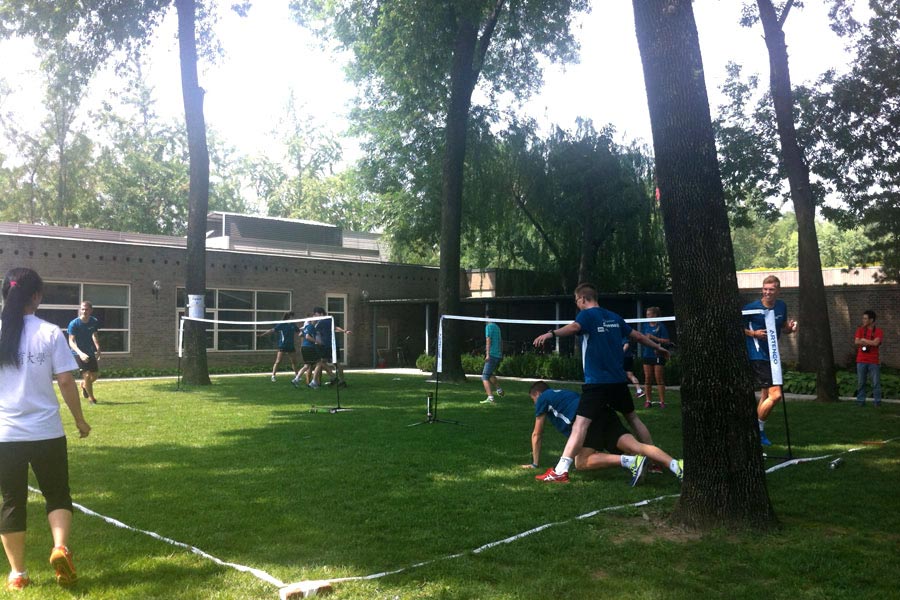 The Danish Badminton Inspiration Team plays warm-up games before the friendly match with Chinese social media users on the outdoor badminton courts at the Danish Embassy in Beijing July 8, 2014. (Photo/People’s Daily Online)