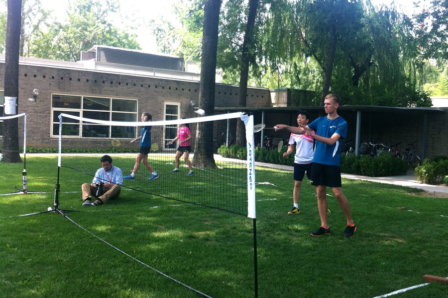 The Danish Badminton Inspiration Team plays a friendly match with Chinese social media users on the outdoor badminton courts at the Danish Embassy in Beijing July 8, 2014. (Photo/People’s Daily Online)