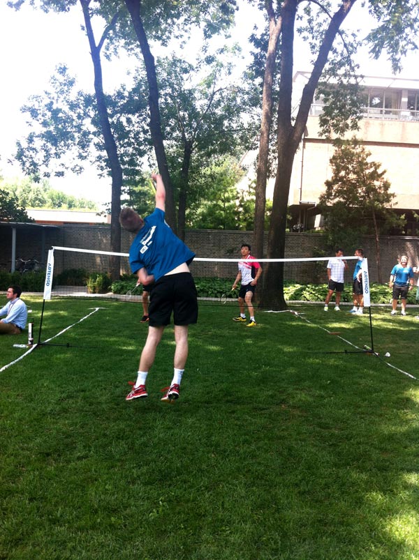 The Danish Badminton Inspiration Team plays a friendly match with Chinese social media users on the outdoor badminton courts at the Danish Embassy in Beijing July 8, 2014. (Photo/People’s Daily Online)