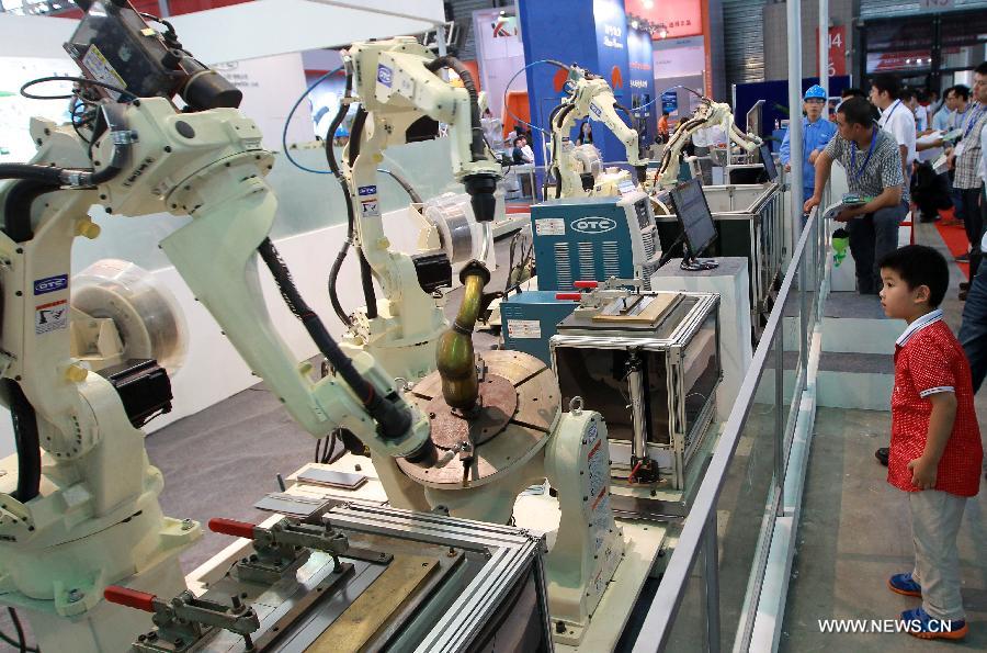 A boy is attracted by robots for welding works during the China International Robot Show in east China's Shanghai, July 9, 2014. The three-day show kicked off on Wednesday, demonstrating latest achievements in the robot industry. (Xinhua/Pei Xin)