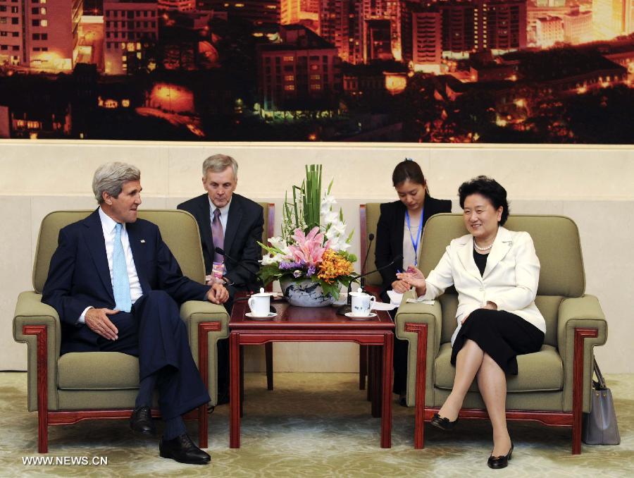 | Chinese Vice Premier Liu Yandong (R) meets with U.S. Secretary of State John Kerry after they jointly hosted the Fifth Round of the China-U.S. High-Level Consultation on People-to-People Exchange (CPE) in Beijing, capital of China, July 10, 2014. (Xinhua/Zhang Duo) |