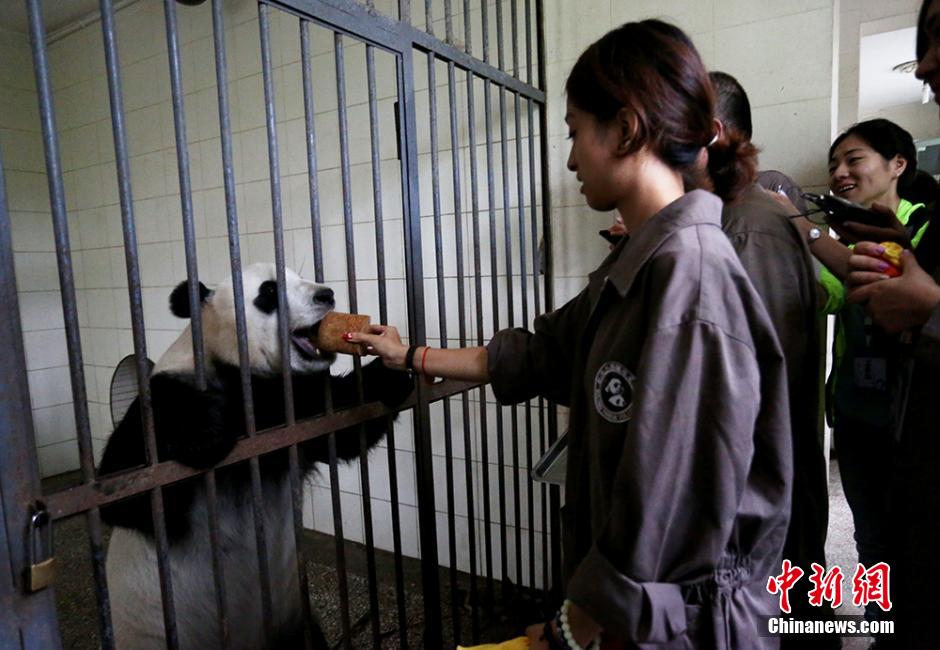 Twelve university students from Taiwan and Sichuan provinces arrive at Ya'an Bifengxia Breeding Base of the China Giant Panda Protection and Research Center, home town of the first Taiwan-born panda Yuan Zai on July 7, 2014. They cleaned the pandas' house, prepared milk and fed the giant pandas and recorded the rhythm of pandas' body movements. ( Chinanews.com/ Li Huajun)