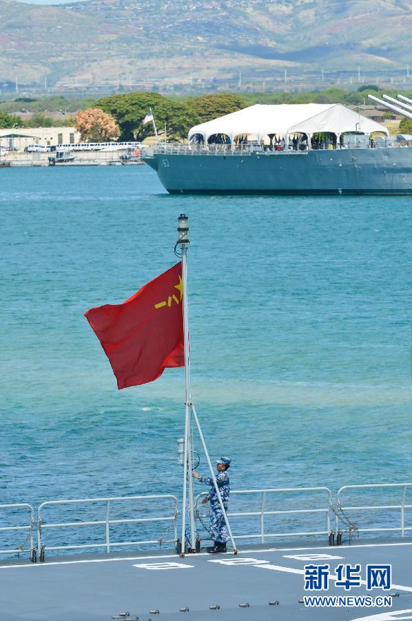 Photo taken on July 9, 2014 shows Chinese navy's missile frigate Yueyang leaves Pearl Harbor in Hawaii, the United States. The Chinese fleet participating in the Rim of the Pacific (RIMPAC) multinational naval exercises left Pearl Harbor for the exercise area on Wednesday. (Xinhua/Qin Haishi)