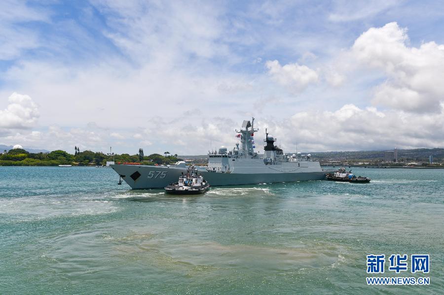 | Photo taken on July 9, 2014 shows Chinese navy's missile frigate Yueyang leaves Pearl Harbor in Hawaii, the United States. The Chinese fleet participating in the Rim of the Pacific (RIMPAC) multinational naval exercises left Pearl Harbor for the exercise area on Wednesday. (Xinhua/Qin Haishi) |