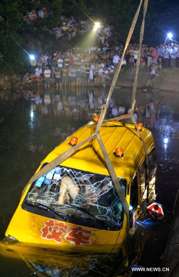 A kindergarten bus is hauled out of a pond at the mountainous Ganzi Village in the Yuelu District of Changsha, capital of central China's Hunan Province, July 11, 2014. All 11 people aboard, namely eight kindergarten children, two teachers and the driver, died after the minivan fell into the pond on Thursday afternoon. The bus was then carrying the children home from the Lelewang Kindergarten at Jinqiao Village in the city of Xiangtan, adjacent to Changsha. (Xinhua/Bai Yu)
