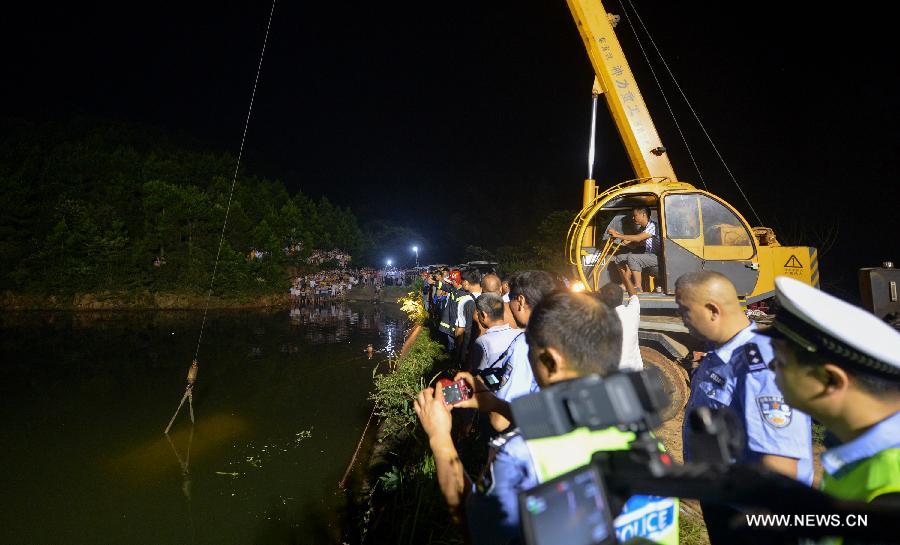 A kindergarten bus is hauled out of a pond at the mountainous Ganzi Village in the Yuelu District of Changsha, capital of central China's Hunan Province, July 11, 2014. All 11 people aboard, namely eight kindergarten children, two teachers and the driver, died after the minivan fell into the pond on Thursday afternoon. The bus was then carrying the children home from the Lelewang Kindergarten at Jinqiao Village in the city of Xiangtan, adjacent to Changsha. (Xinhua/Bai Yu)
