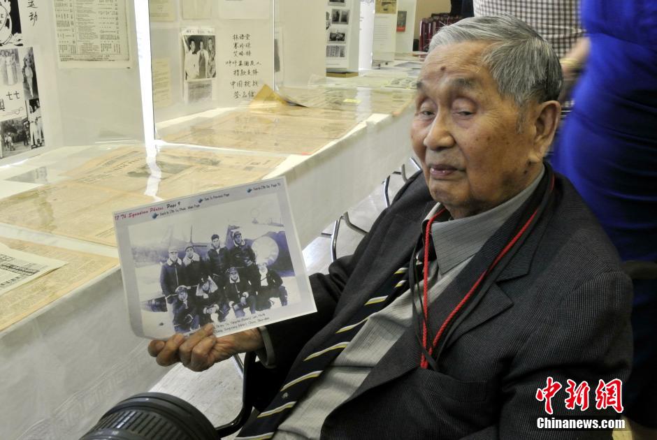Zhang Songyang, a 99- year-old ethnic Chinese Flying Tiger pilot presents the photo that depicts his resistance against the Japanese army.(Chinanews.com/ Liu Dan)