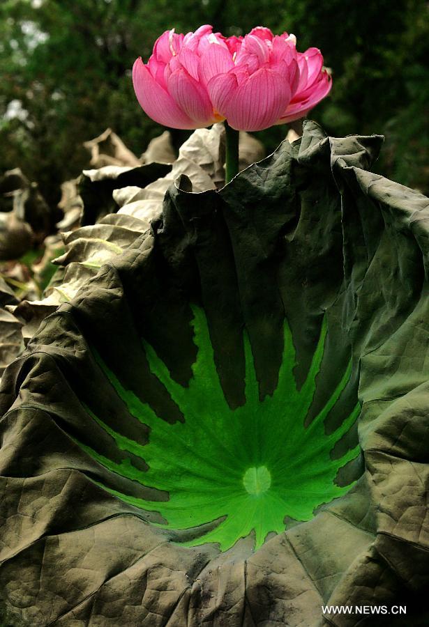 A lotus flower is in full bloom at the Lotus Park in Luoyang, central China's Henan Province, July 12, 2014. (Xinhua/Wang Song)