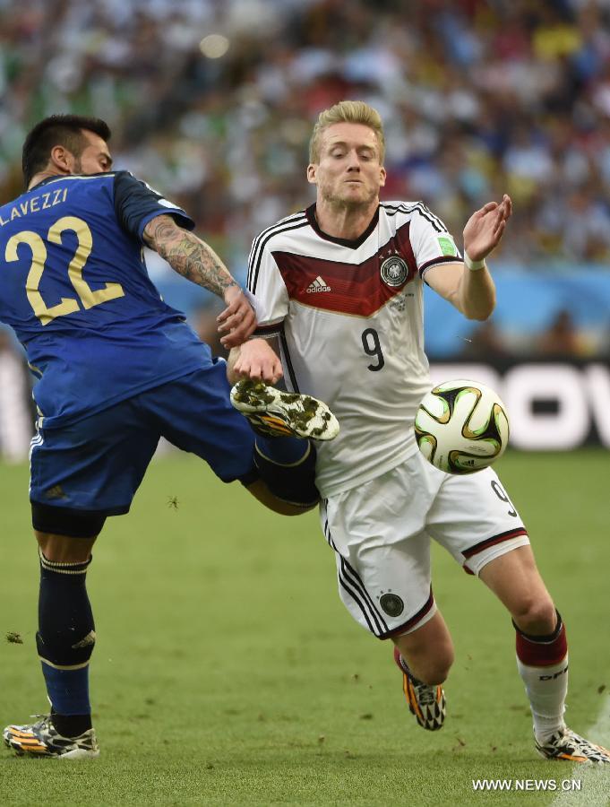 Germany's Andre Schuerrle (R) strives for the ball against Argentina's Ezequiel Lavezzi during the final match between Germany and Argentina of 2014 FIFA World Cup at the Estadio do Maracana Stadium in Rio de Janeiro, Brazil, on July 13, 2014. (Xinhua/Yang Lei)