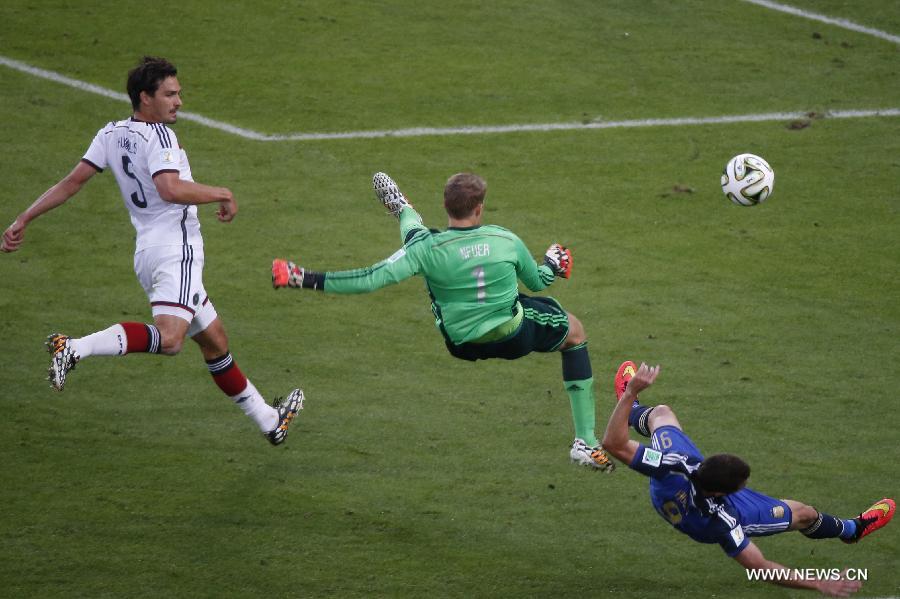 Germany's goalkeeper Manuel Neuer (C) vies with Argentina's Gonzalo Higuain (R) during the final match between Germany and Argentina of 2014 FIFA World Cup at the Estadio do Maracana Stadium in Rio de Janeiro, Brazil, on July 13, 2014.(Xinhua/Liao Yujie)