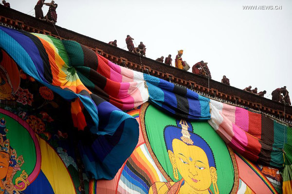 A new thangka picture of the Maitreya, or the Buddha of the Future, was unveiled at 11:30 a.m. It was 40 meters high, 29 meters wide and sewn from silk by dozens of tailors and painters in seven months.