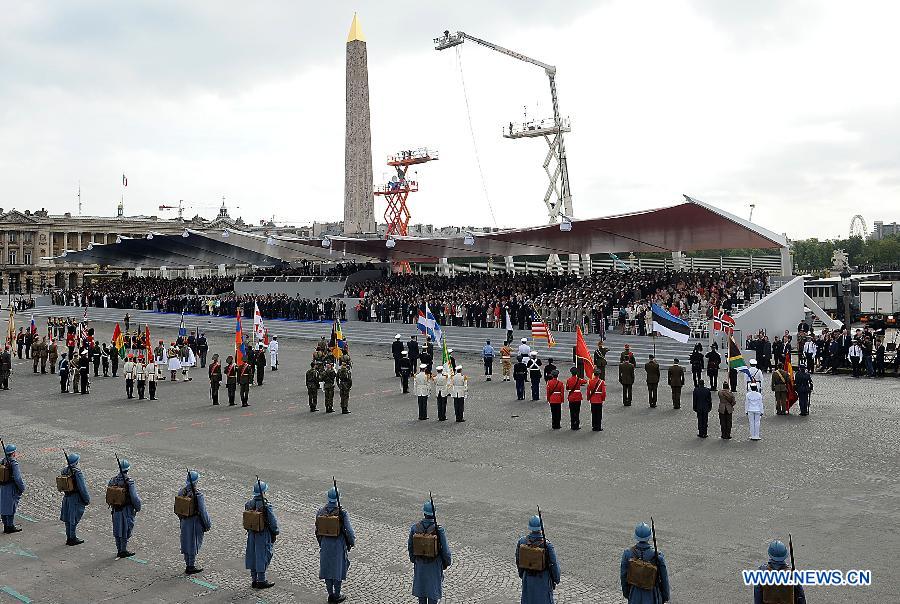 Flag bearers of countries involved in World War I attend the annual Bastille Day military parade in Paris on July 14, 2014. France has issued an unprecedented invitation to more than 70 countries involved in World War I to take part in its annual Bastille Day military parade. (Xinhua/Etienne Laurent)