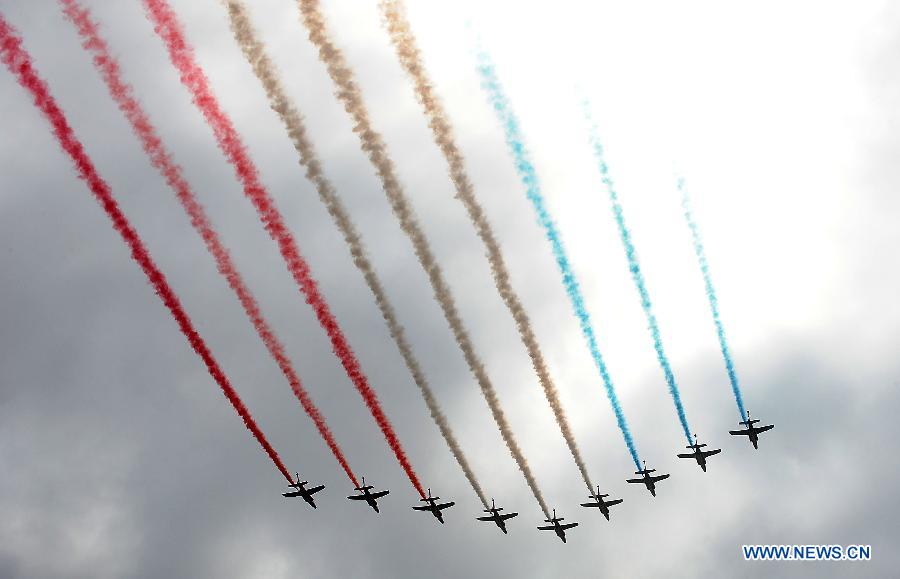 La Patrouille de France of French Air Force flies over Paris during the annual Bastille Day military parade on July 14, 2014. France has issued an unprecedented invitation to more than 70 countries involved in World War I to take part in its annual Bastille Day military parade. (Xinhua/Etienne Laurent)