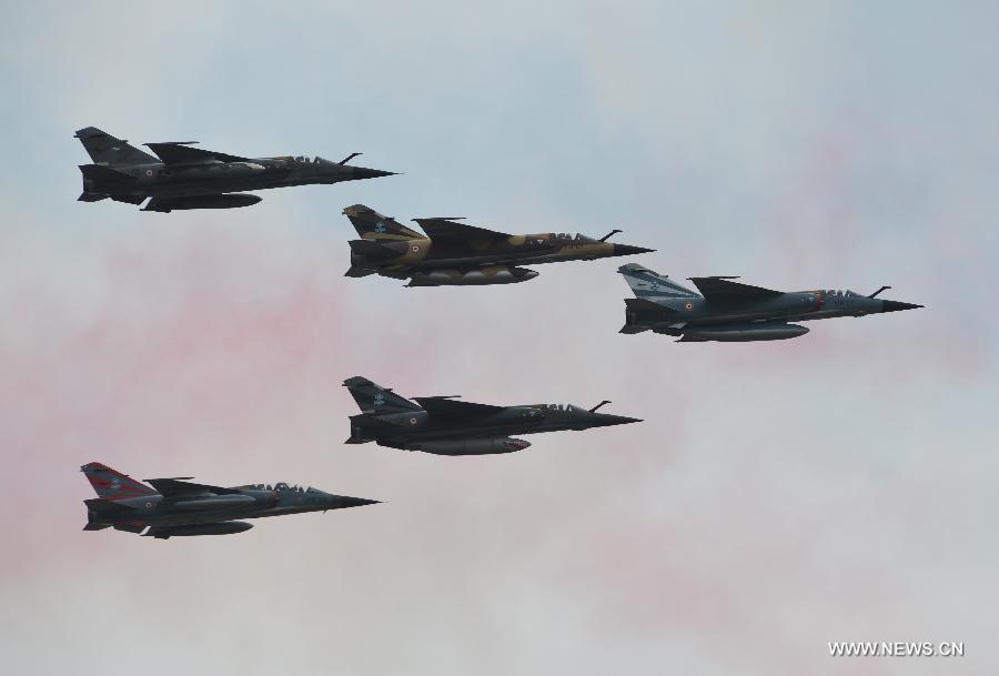 French Air Force aircrafts fly in formation over Paris during the annual Bastille Day military parade, in France, on July 14, 2014. France celebrated National Day with a grand parade, which was participated by troops from 80 nations. (Xinhua/Li Genxing)
