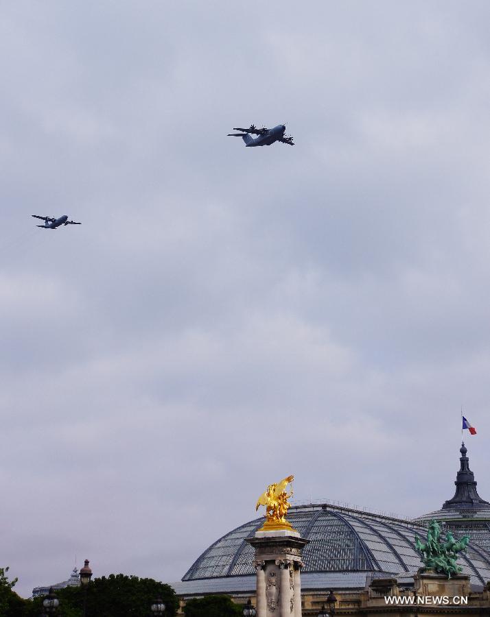 French Air Force aircrafts fly in formation over Paris during the annual Bastille Day military parade, in France, on July 14, 2014. France celebrated National Day with a grand parade, which was participated by troops from 80 nations. (Xinhua/Li Genxing)